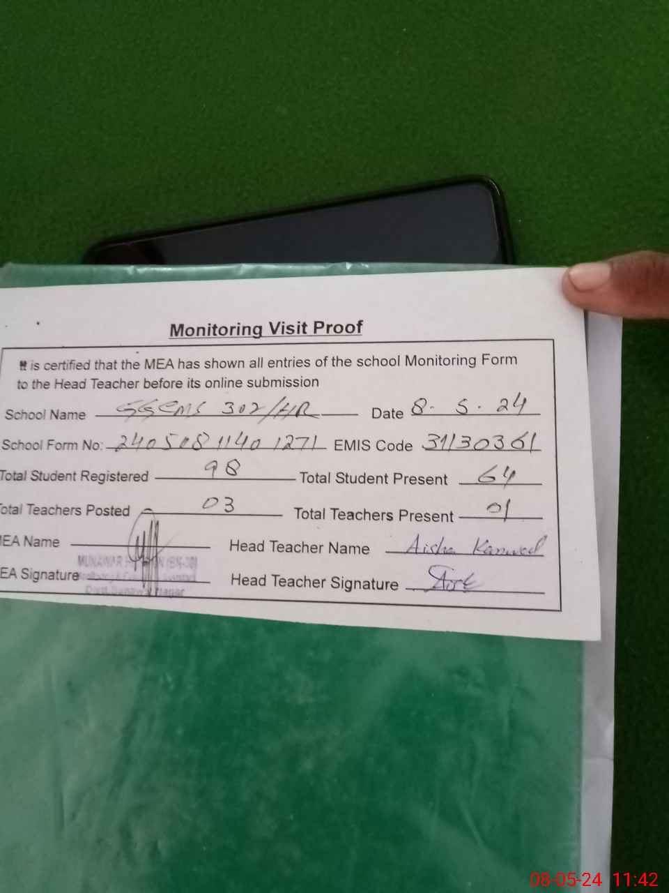 | Attendance Register | Head Teacher | MEA with School | Visit Proof |