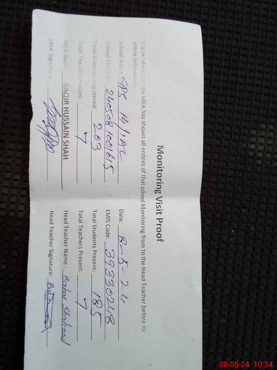 | Monitoring Date: 08-05-2024 | Start Time: 08-05-2024 10:00 AM | End Time: 08-05-2024 10:34 AM | Name of MEA: BA**** HU**** SH**** | |