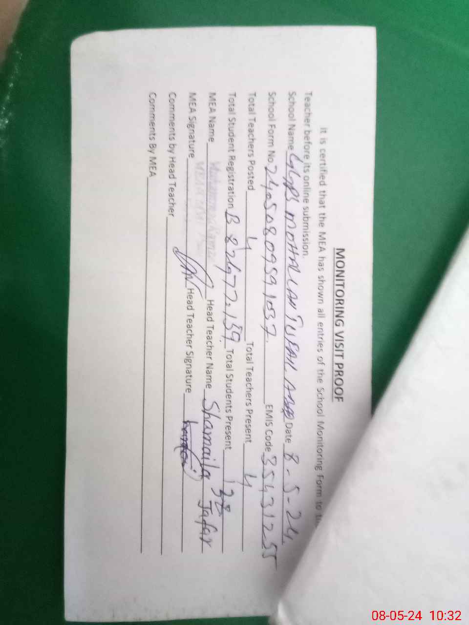 | Attendance Register | Head Teacher | MEA with School | Visit Proof |