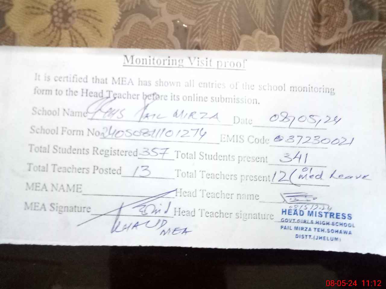 | Attendance Register | Head Teacher | MEA with School | Visit Proof |