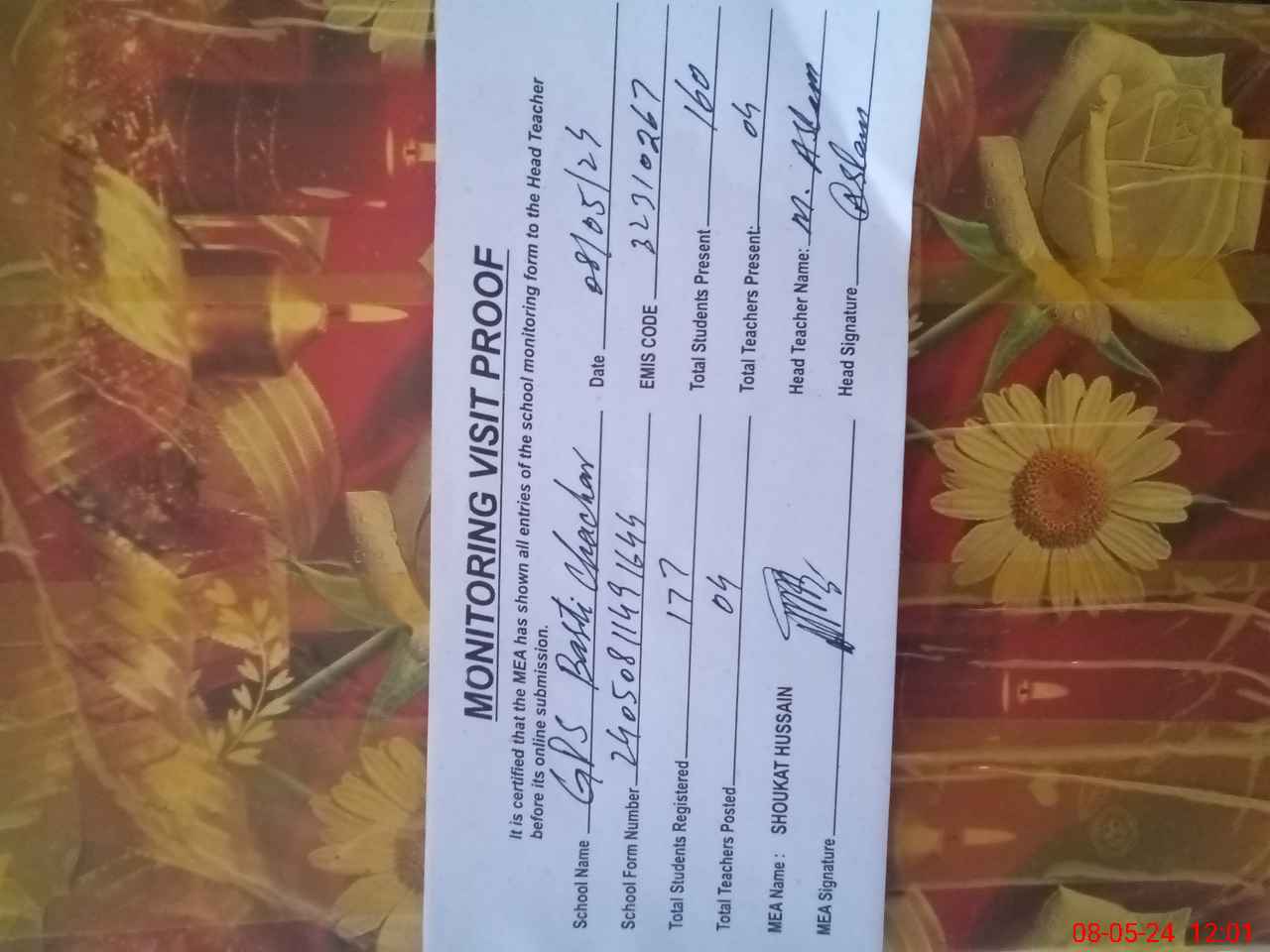 | Attendance Register | Head Teacher | MEA with School | Visit Proof |