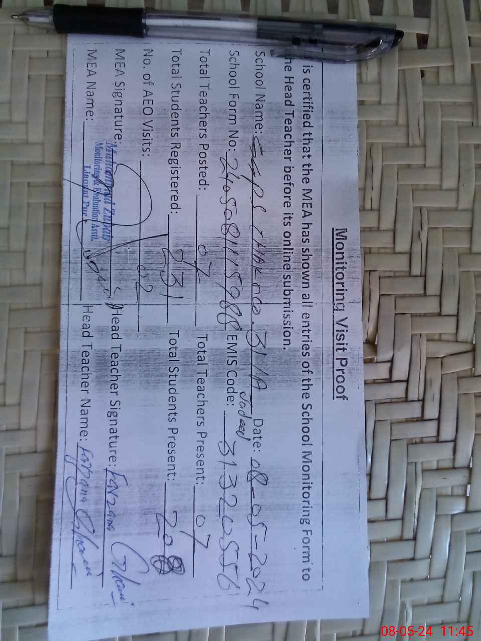| Attendance Register | Head Teacher | MEA with School | Visit Proof |