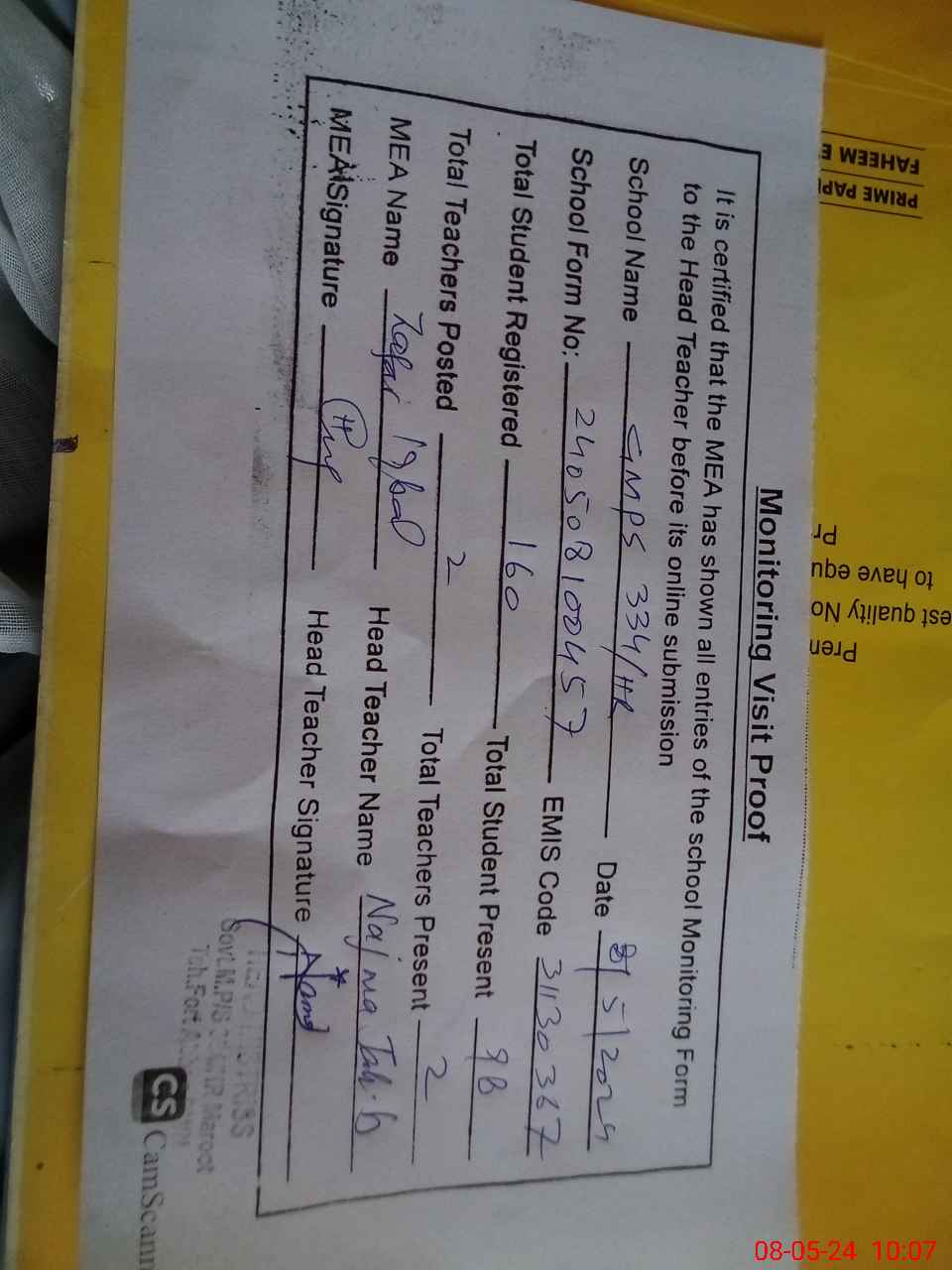| Attendance Register | Head Teacher | MEA with School | Visit Proof |