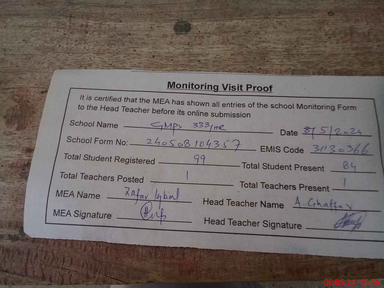 | Attendance Register | Head Teacher | MEA with School | Visit Proof |