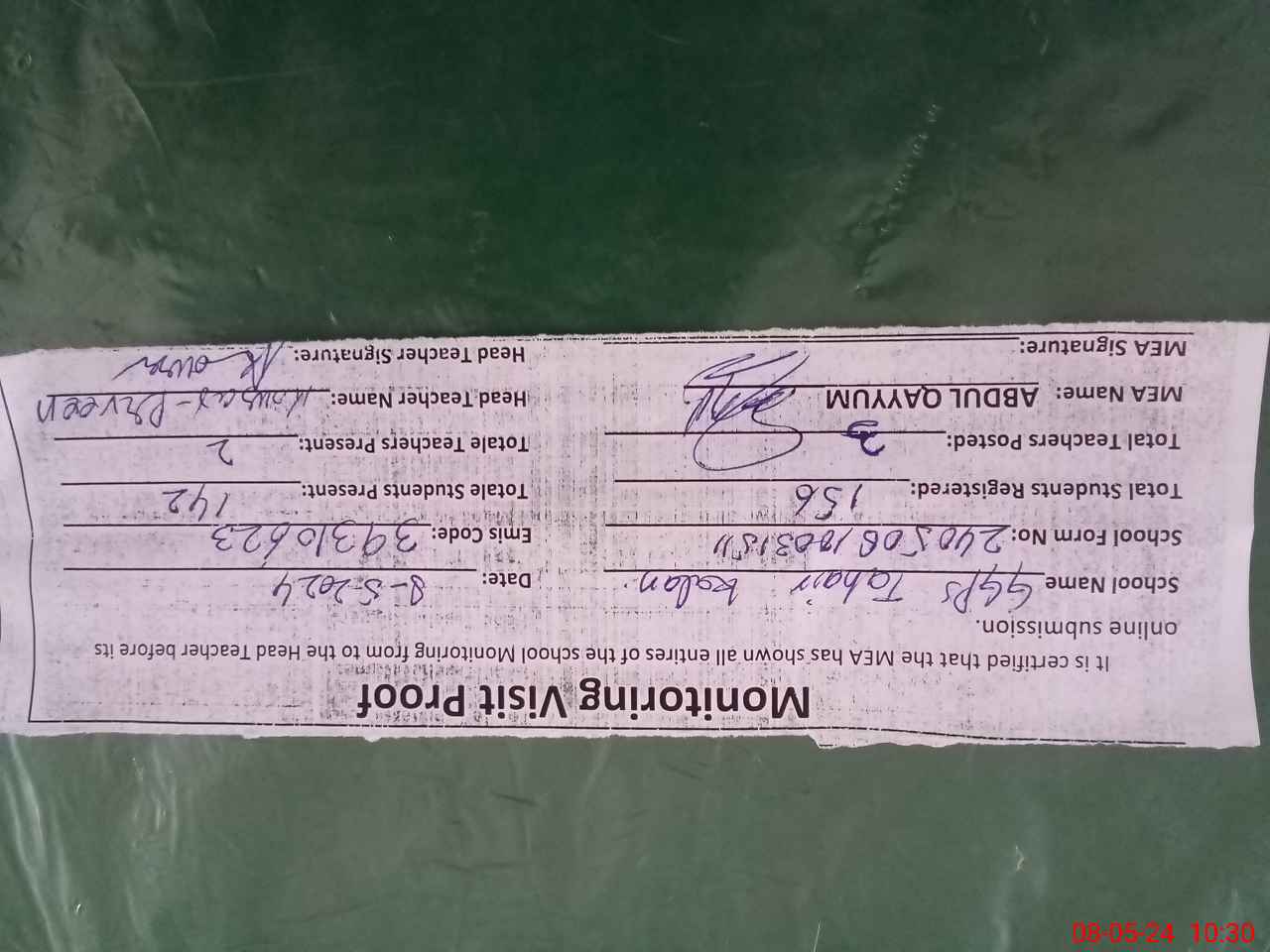 | Attendance Register | Head Teacher | MEA with School | Visit Proof |