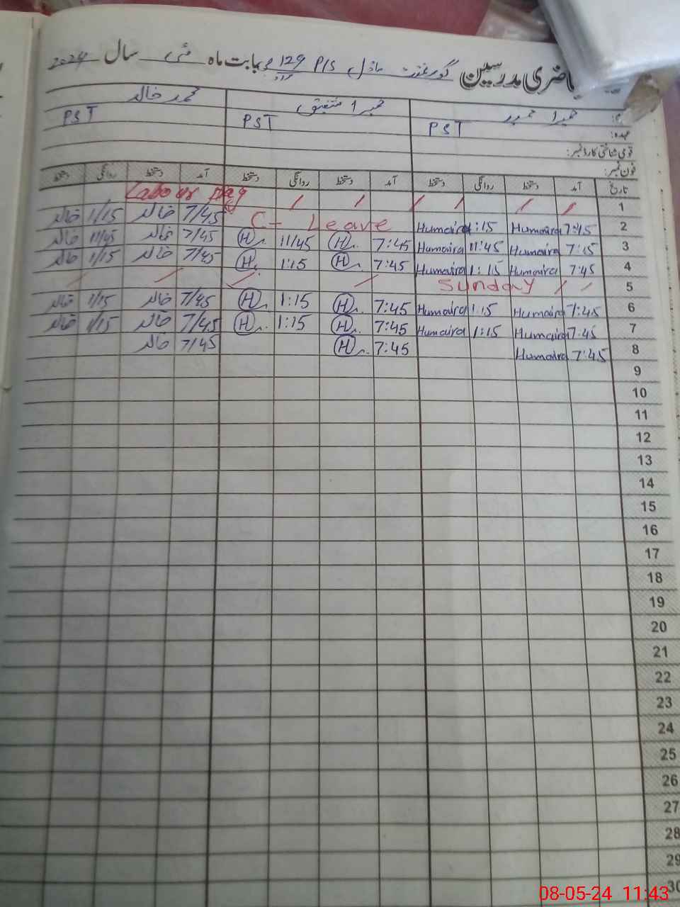 | CNIC | Full Name | Designation | R/C | Absence During Last Calender Month |