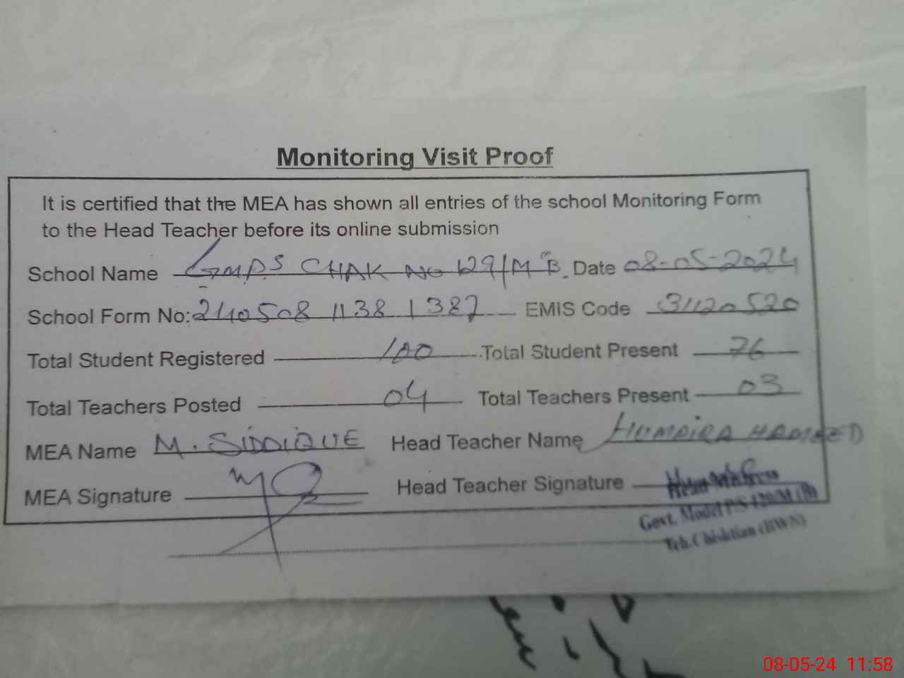 | Attendance Register | Head Teacher | MEA with School | Visit Proof |