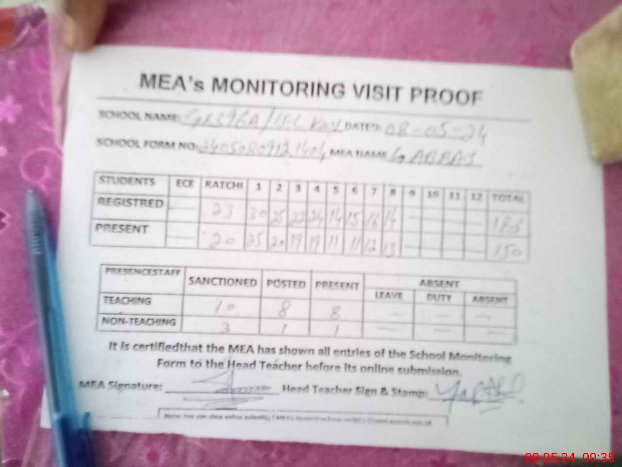 | Attendance Register | Head Teacher | MEA with School | Visit Proof |