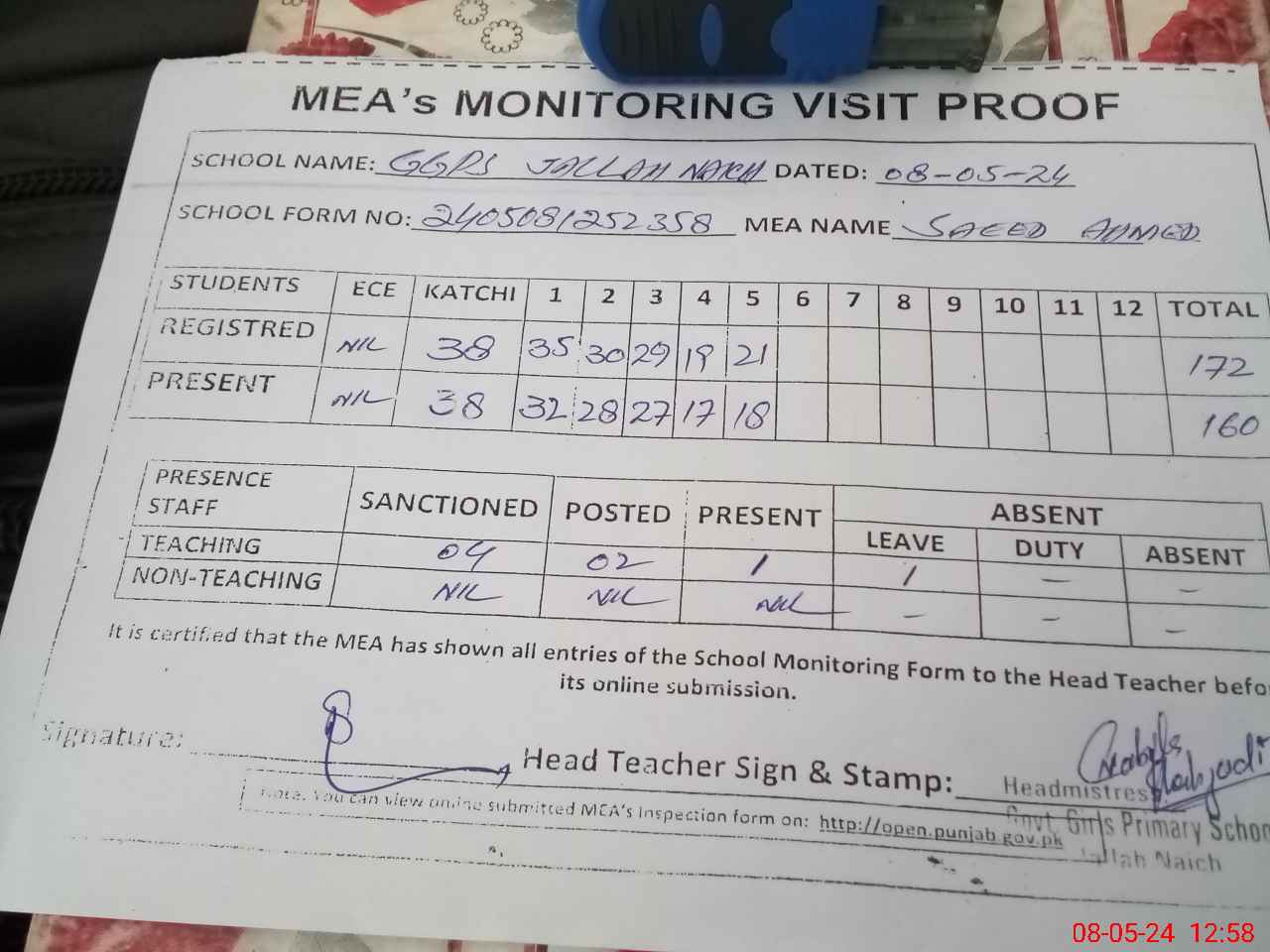 | Attendance Register | Head Teacher | MEA with School | Visit Proof |