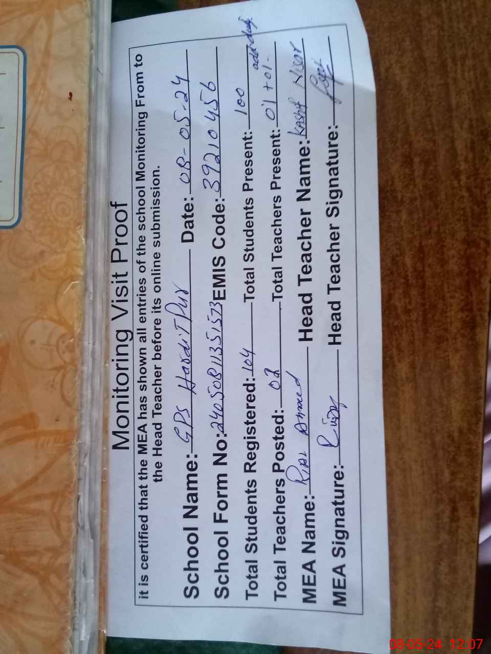 | Attendance Register | Head Teacher | MEA with School | Visit Proof |