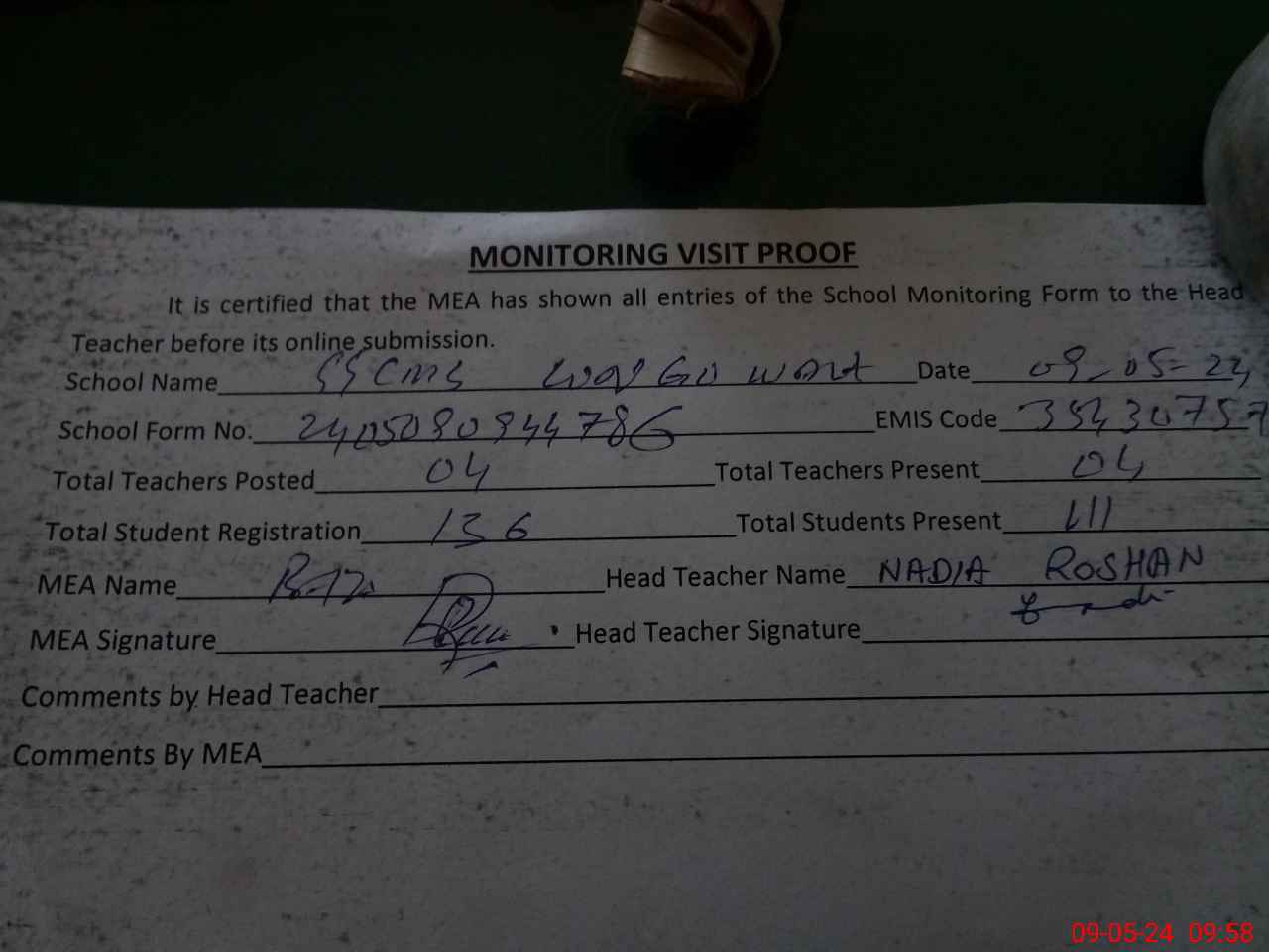 | Attendance Register | Head Teacher | MEA with School | Visit Proof |
