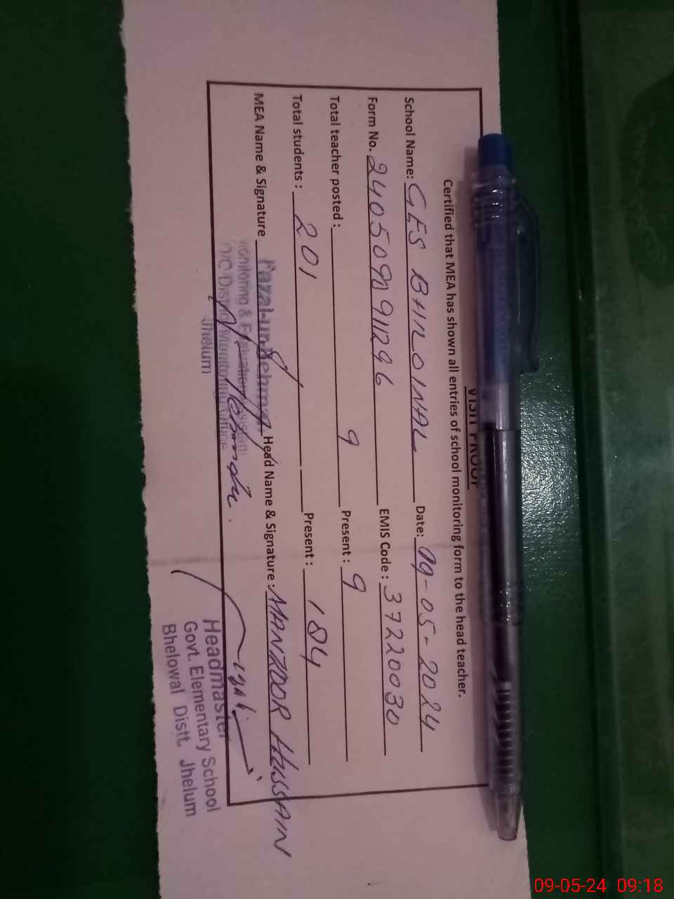 | Attendance Register | Head Teacher | MEA with School | Visit Proof |