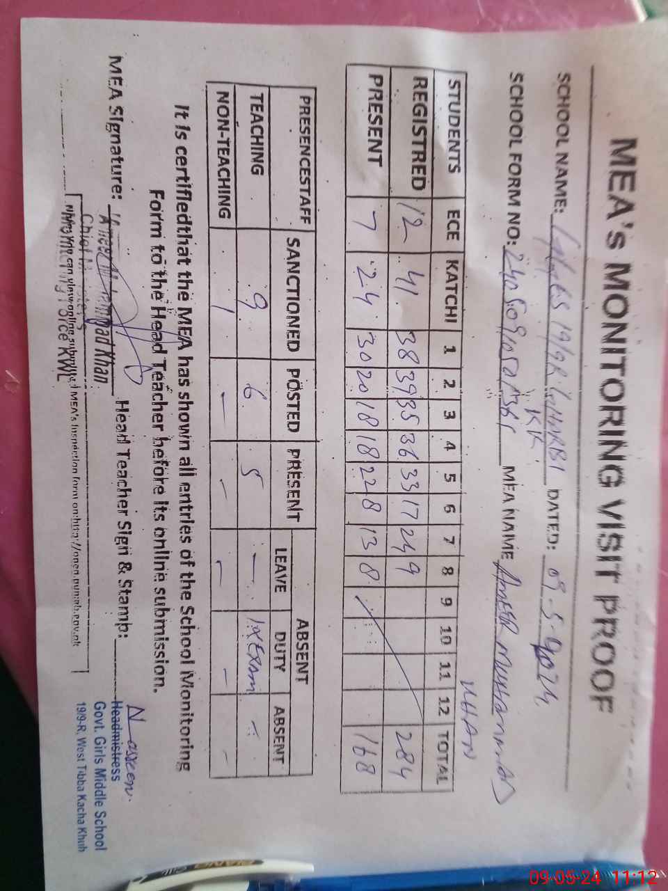 | Attendance Register | Head Teacher | MEA with School | Visit Proof |