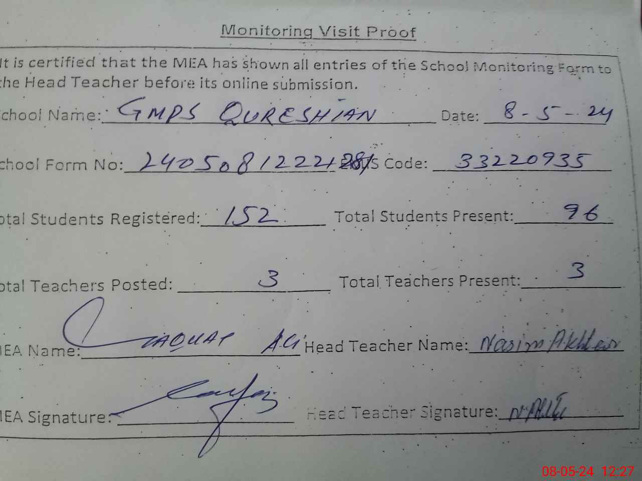 | EMIS Code: 33220935 | Name of School: GMPS QURESHIAN | |||