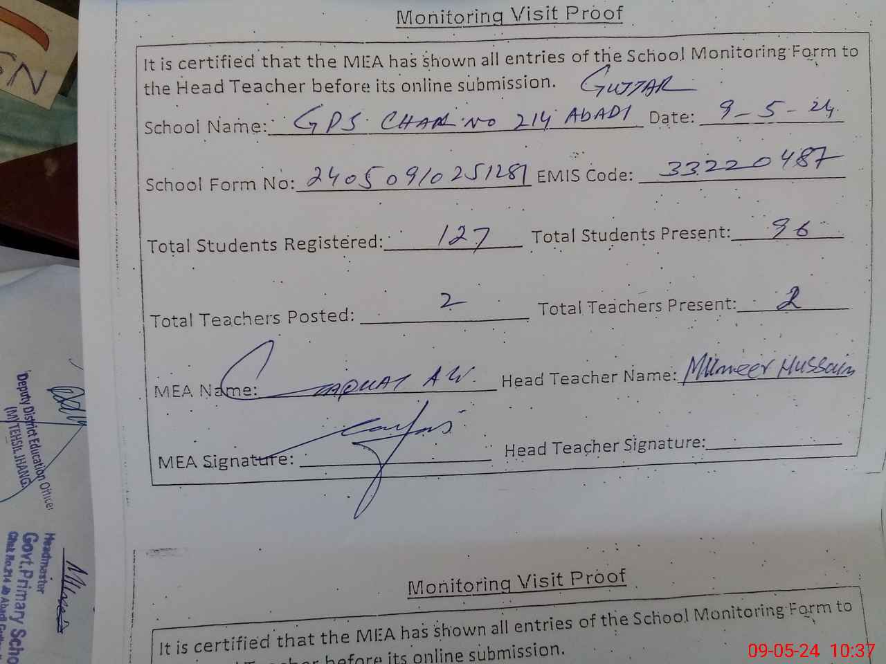 | Certified that this School was Inspected by the Undersigned MEA/DMO Today and the Information Stated Above is as Per Record. | |||||