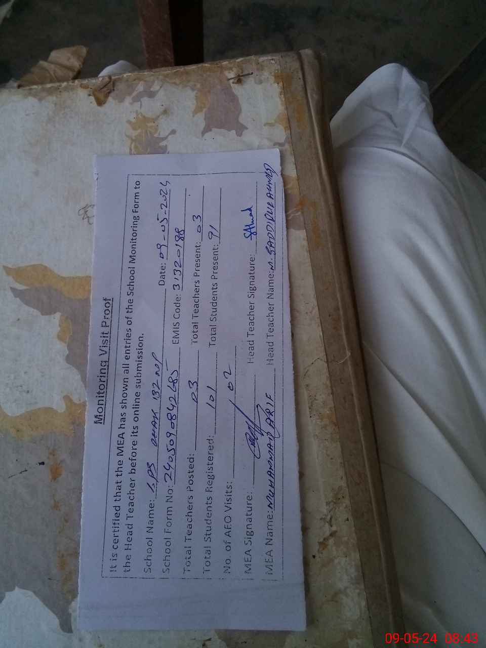 | Attendance Register | Head Teacher | MEA with School | Visit Proof |
