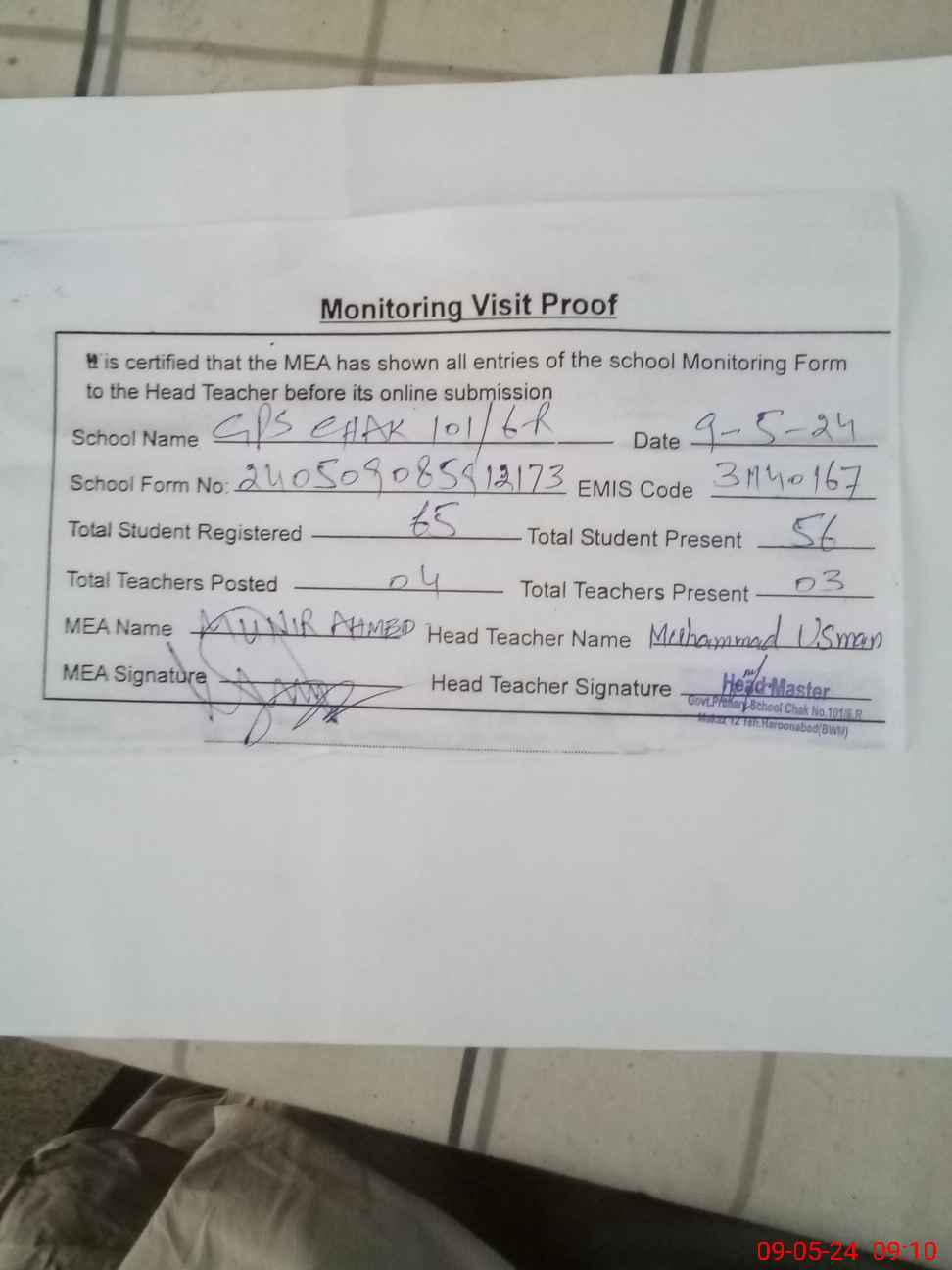 | Attendance Register | Head Teacher | MEA with School | Visit Proof |