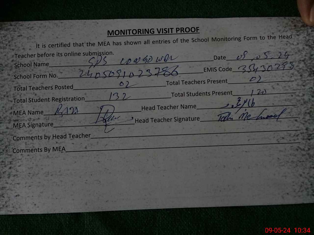 | Attendance Register | Head Teacher | MEA with School | Visit Proof |