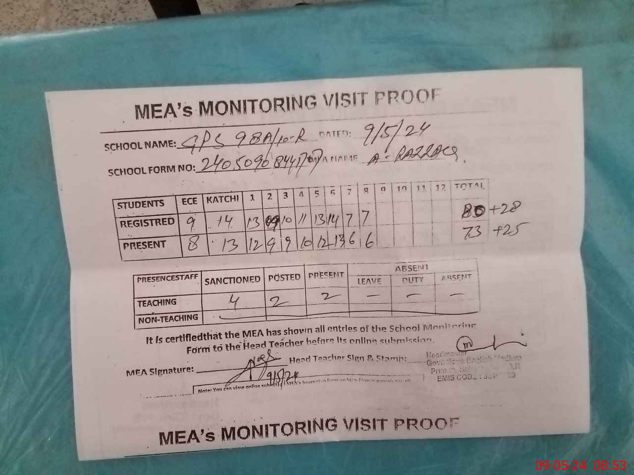 | Attendance Register | Head Teacher | MEA with School | Visit Proof |