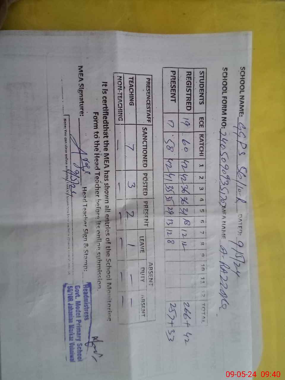 | Attendance Register | Head Teacher | MEA with School | Visit Proof |