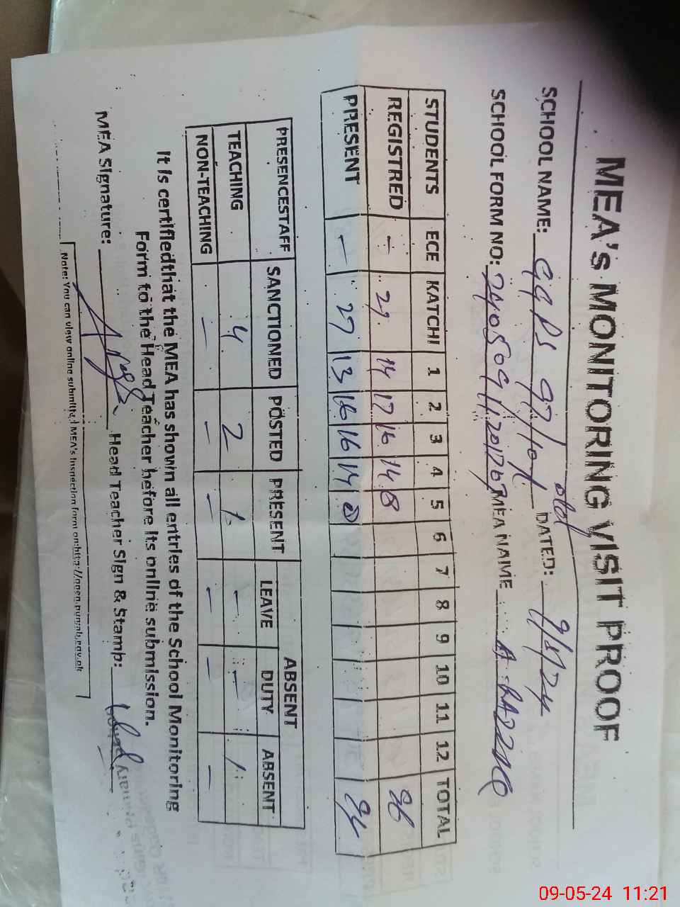 | Attendance Register | Head Teacher | MEA with School | Visit Proof |