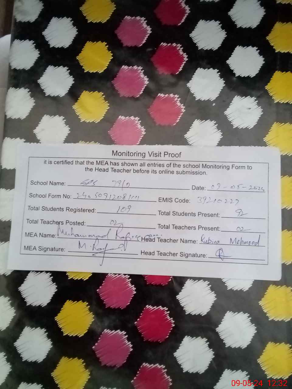 | Certified that this School was Inspected by the Undersigned MEA/DMO Today and the Information Stated Above is as Per Record. | |||||
