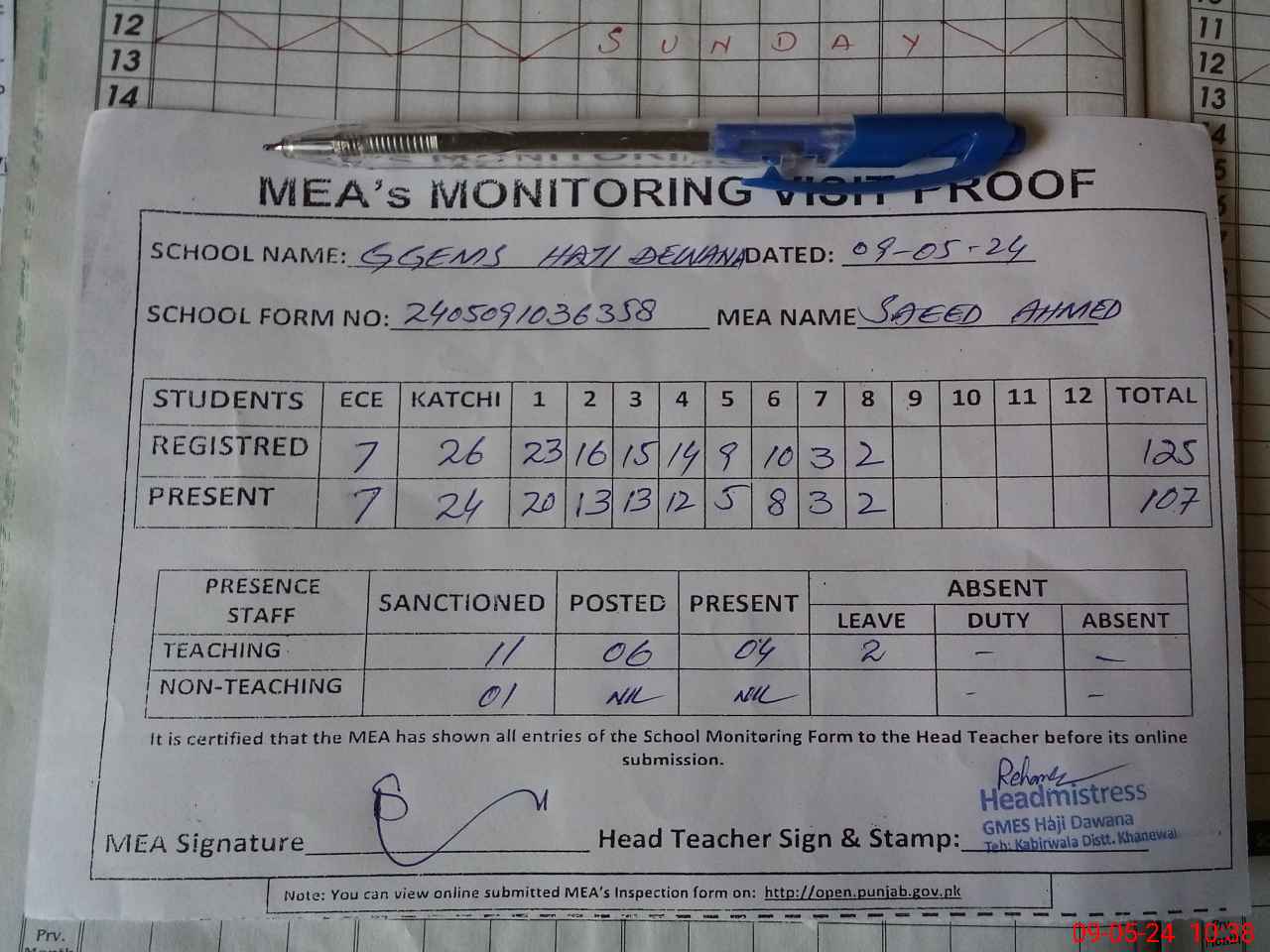 | Attendance Register | Head Teacher | MEA with School | Visit Proof |