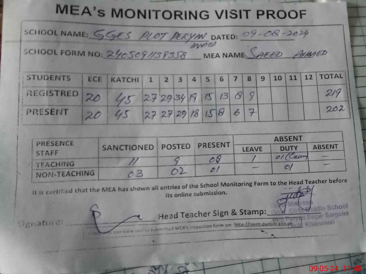 | Attendance Register | Head Teacher | MEA with School | Visit Proof |