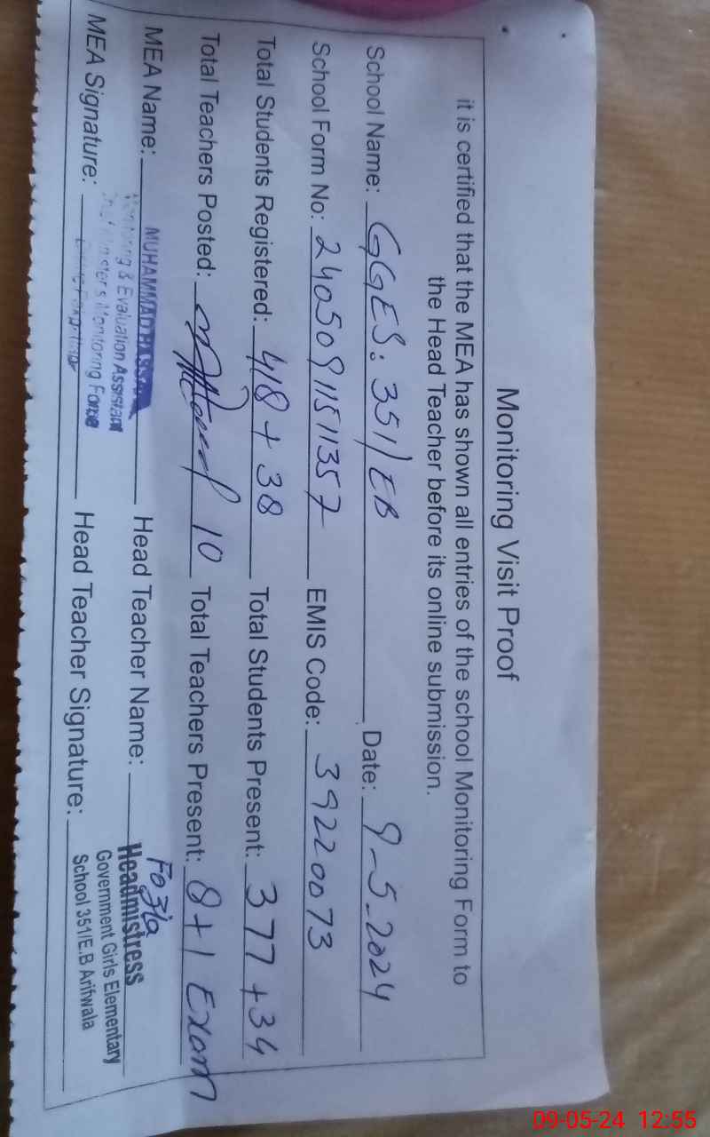 | Certified that this School was Inspected by the Undersigned MEA/DMO Today and the Information Stated Above is as Per Record. | |||||