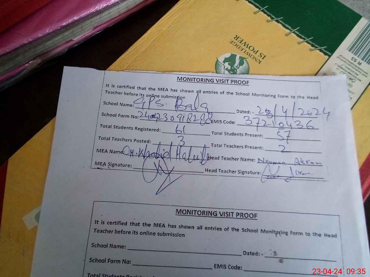 | Attendance Register | Head Teacher | MEA with School | Visit Proof |