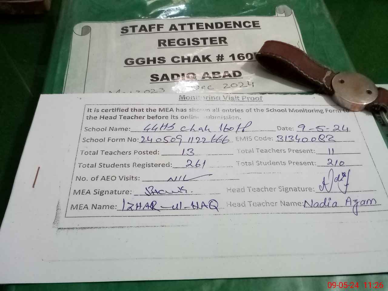 | Attendance Register | Head Teacher | MEA with School | Visit Proof |