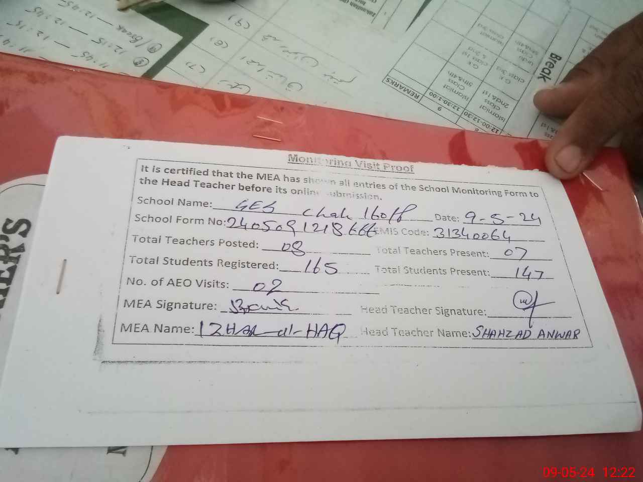 | Attendance Register | Head Teacher | MEA with School | Visit Proof |