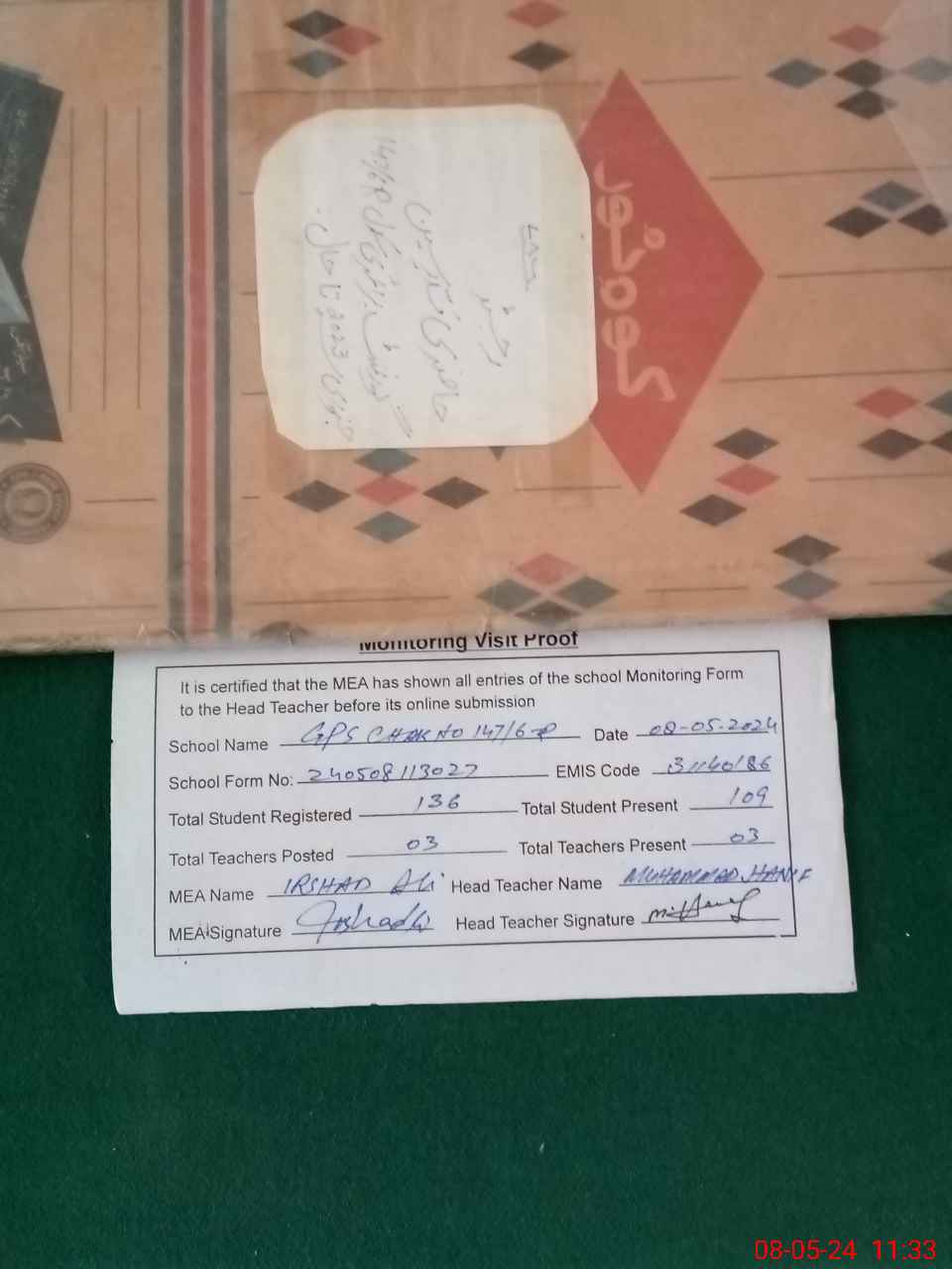 | EMIS Code: 31140186 | Name of School: GPS CHAK NO. 147/6-R | |||