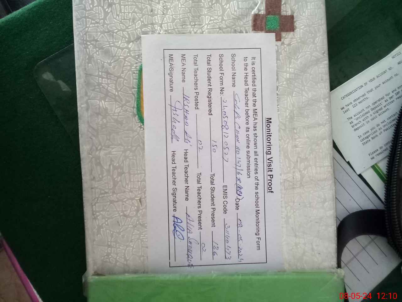 | Attendance Register | Head Teacher | MEA with School | Visit Proof |