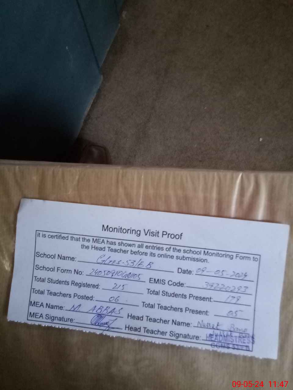 | Attendance Register | Head Teacher | MEA with School | Visit Proof |