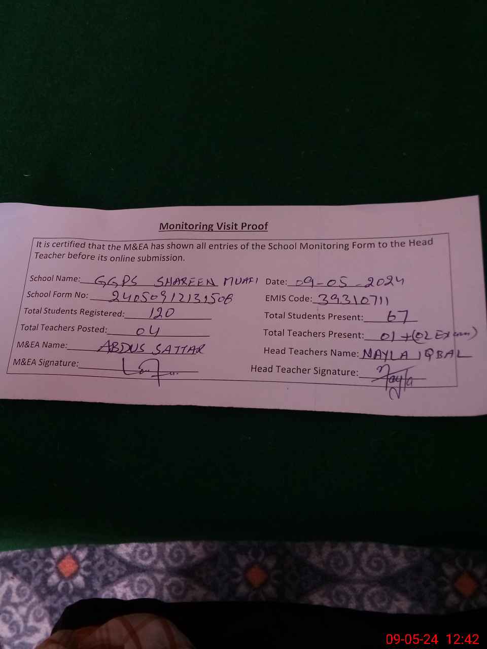 | Certified that this School was Inspected by the Undersigned MEA/DMO Today and the Information Stated Above is as Per Record. | |||||
