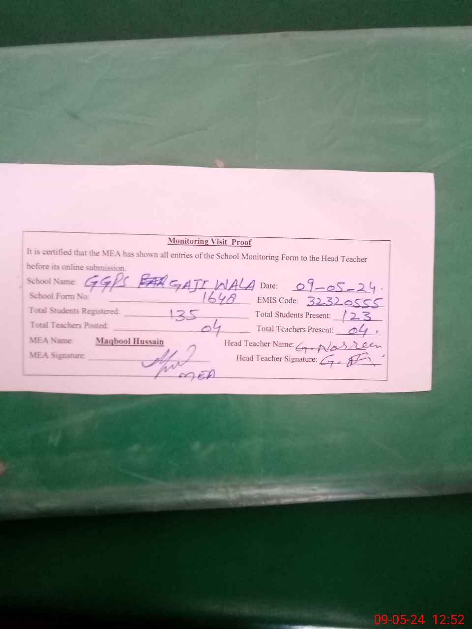 | Attendance Register | Head Teacher | MEA with School | Visit Proof |