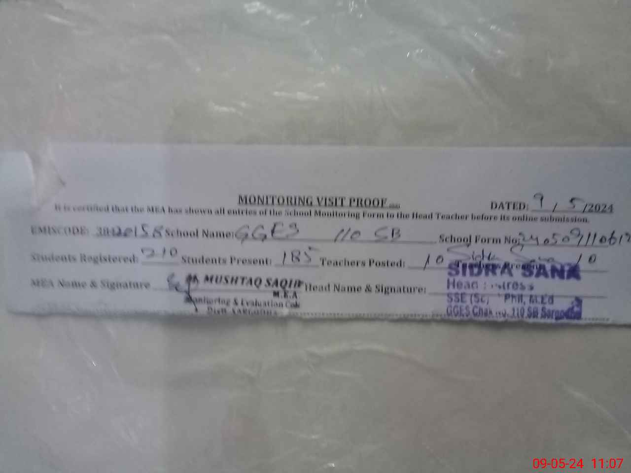 | Name: Si**** Sa**** Designation: (School Headmaster's/Headmistress's) SSE Sci Phone/Cell Number: 03**** |