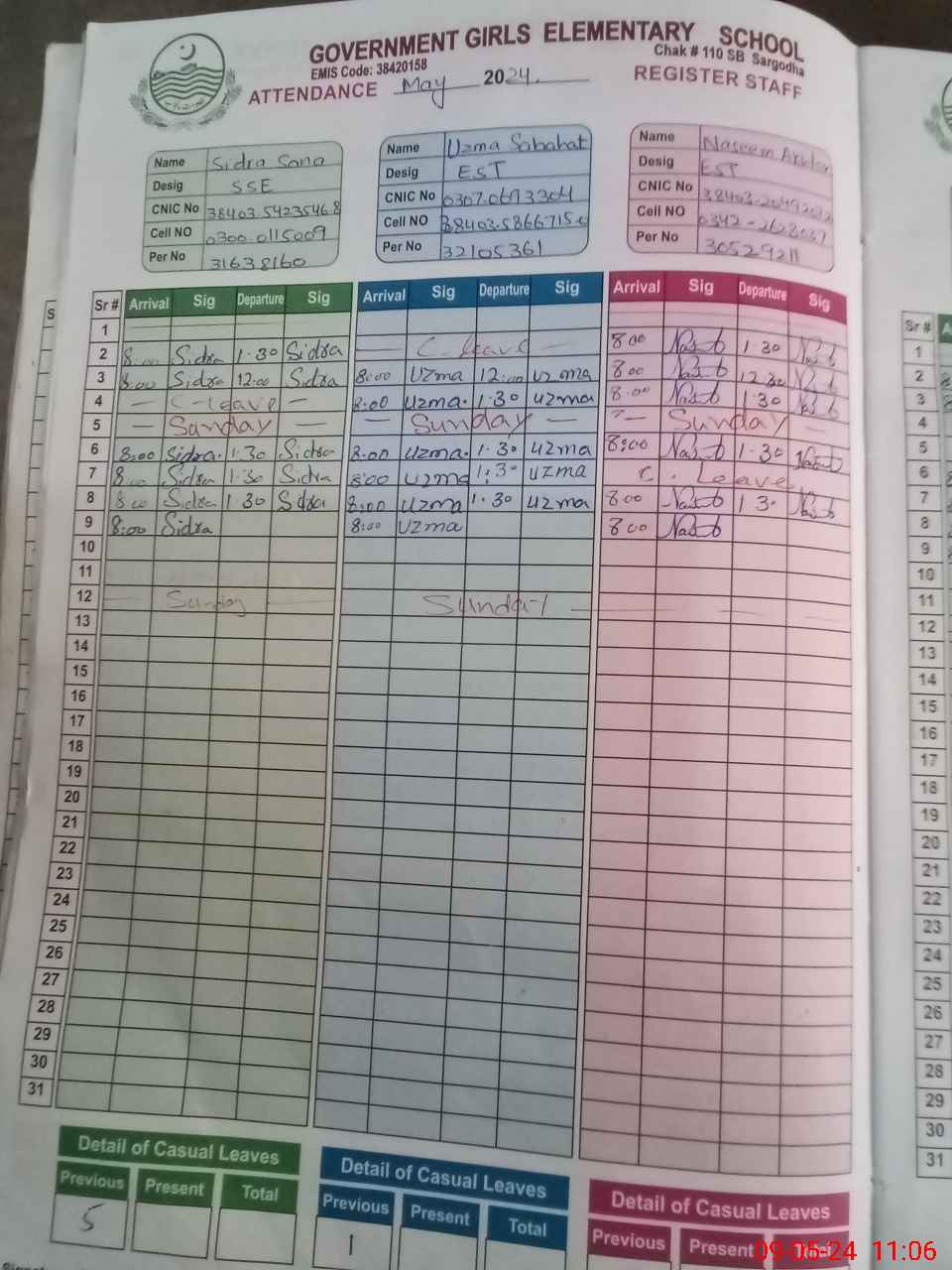 | CNIC | Full Name | Designation | R/C | Absence During Last Calender Month |