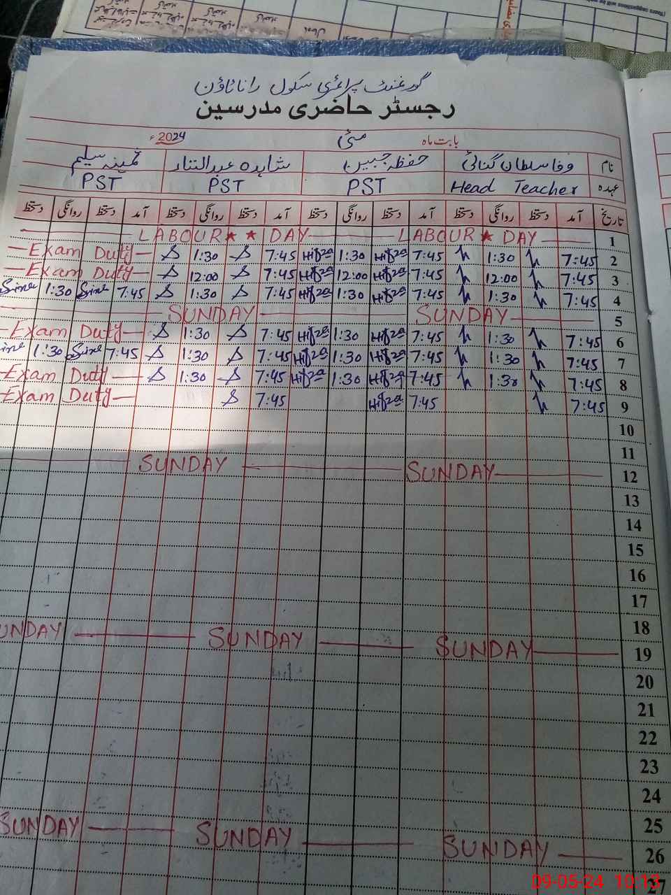 | 34**** | Sa**** Sa**** | PST | Regular | 0 | 0 | 0 | 0 | 0 | 0 | 0 | 0 | 0 | Exam Duty |