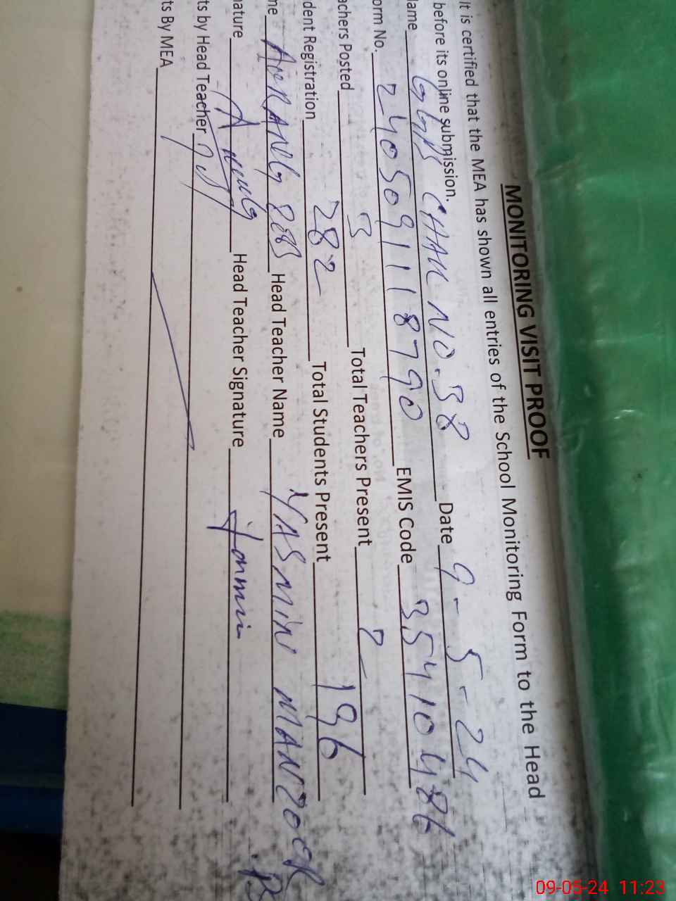 | Attendance Register | Head Teacher | MEA with School | Visit Proof |