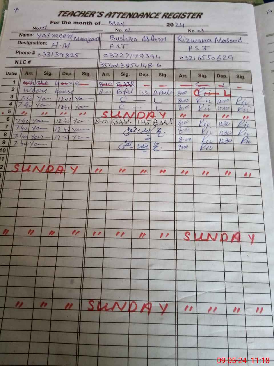 | CNIC | Full Name | Designation | R/C | Absence during last cal. month |