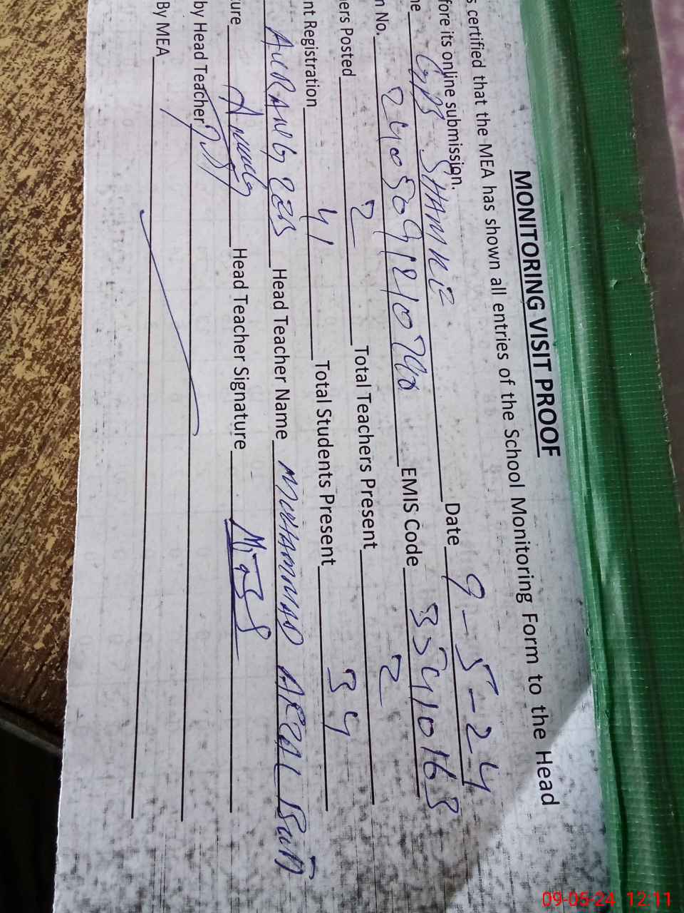 | Attendance Register | Head Teacher | MEA with School | Visit Proof |