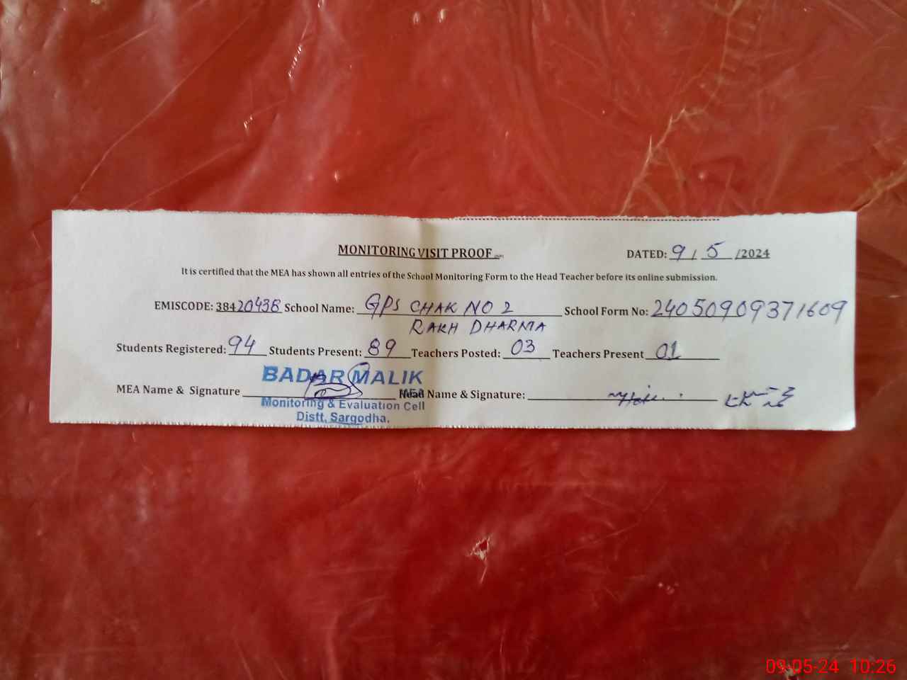| EMIS Code: 38420438 | Name of School: GPS CHAK NO.2 RAKH DHAREMA | |||