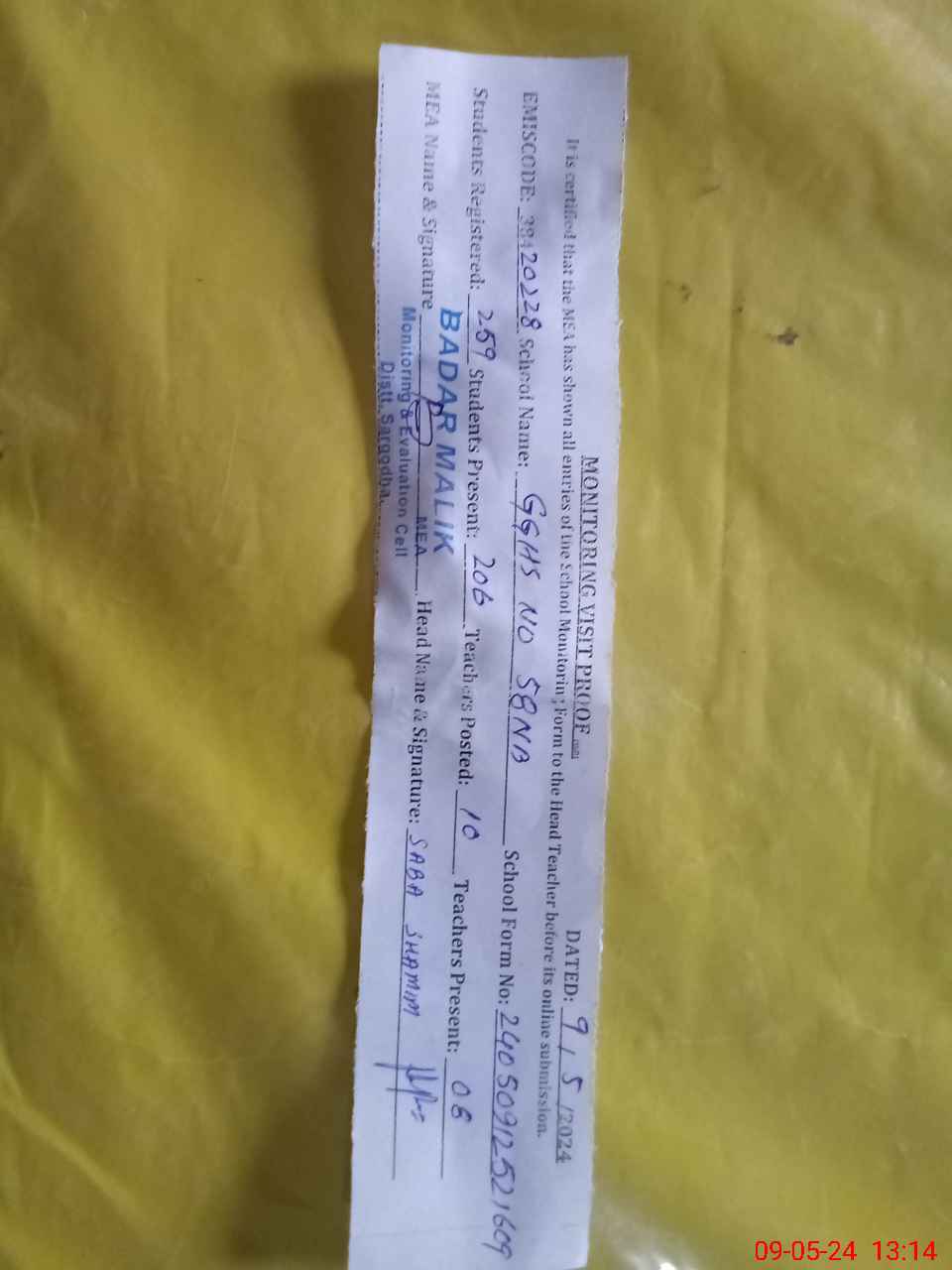 | Certified that this School was Inspected by the Undersigned MEA/DMO Today and the Information Stated Above is as Per Record. | |||||