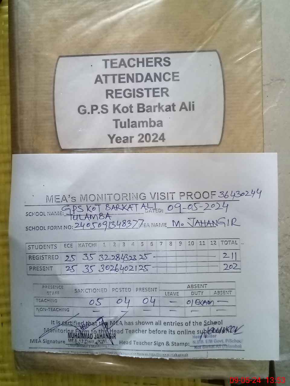 | Attendance Register | Head Teacher | MEA with School | Visit Proof |