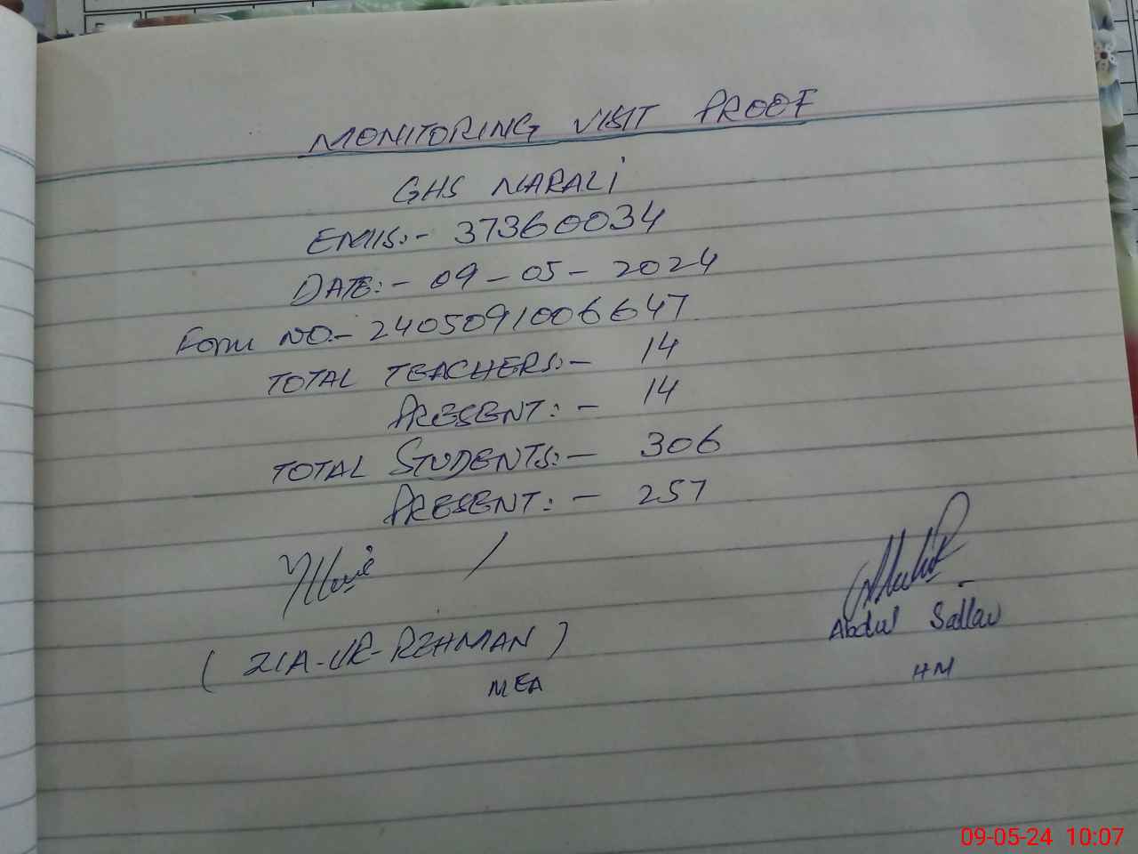 | Attendance Register | Head Teacher | MEA with School | Visit Proof |