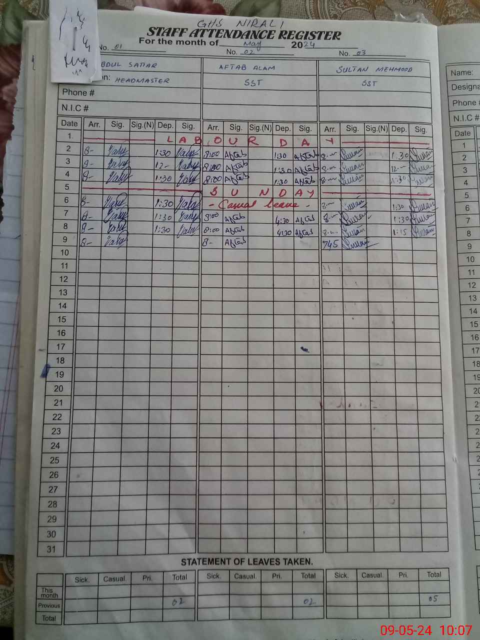 | CNIC | Full Name | Designation | R/C | Absence During Last Calender Month |