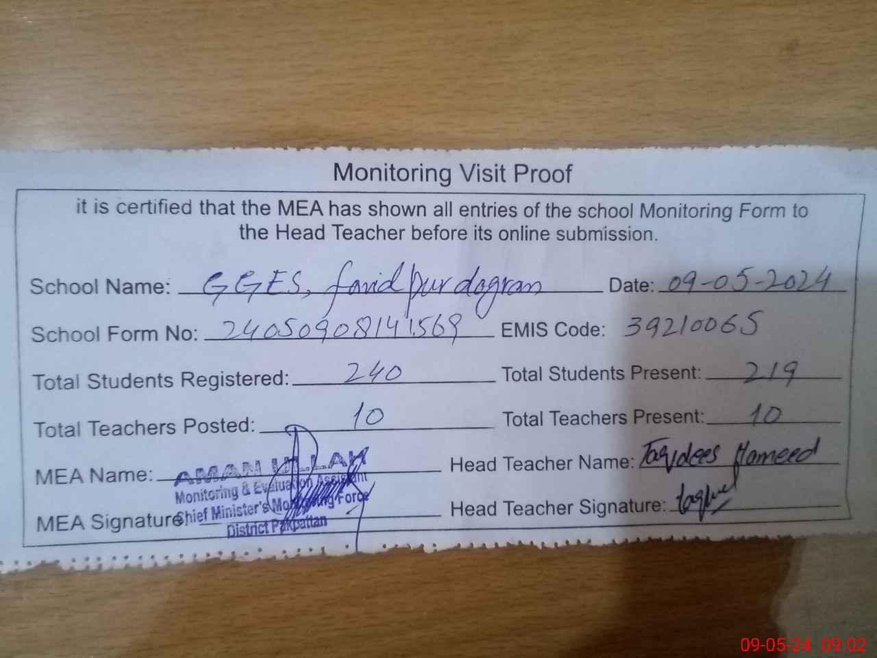 | Attendance Register | Head Teacher | MEA with School | Visit Proof |