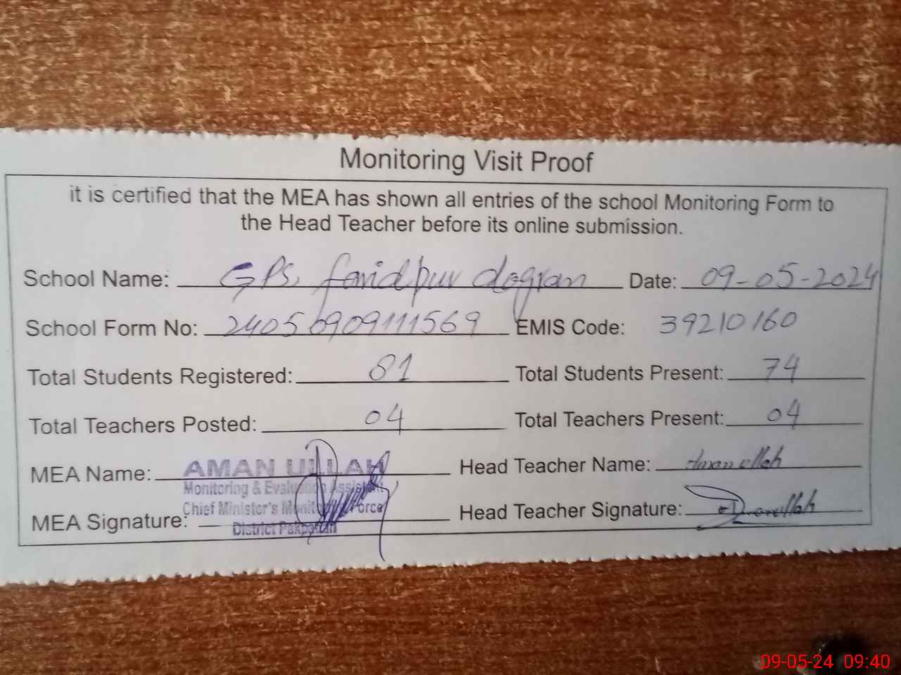 | Attendance Register | Head Teacher | MEA with School | Visit Proof |